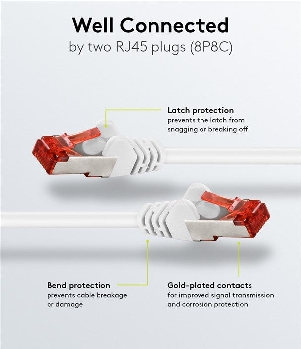 Het is een voorgemonteerde, dubbel afgeschermde LAN-kabel met RJ45-stekkers, speciaal ontworpen om uw netwerkapparaten met elkaar te verbinden.