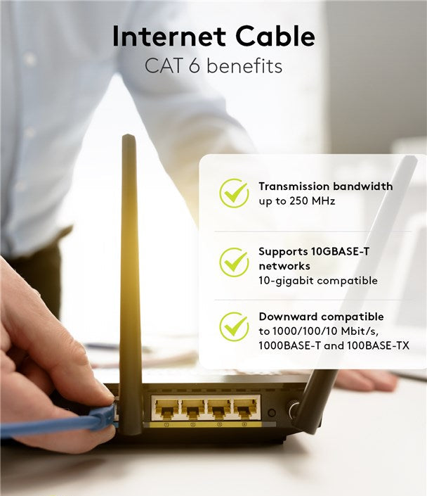 Deze CAT 6 internetkabel is geschikt voor snelle internetverbindingen tot wel 10 Gigabit Ethernet (10BASE-T, 100BASE-TX, 1000BASE-T, 10/100/1000/10000 Mbit/s).